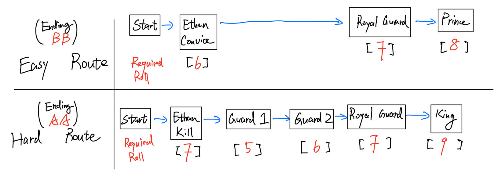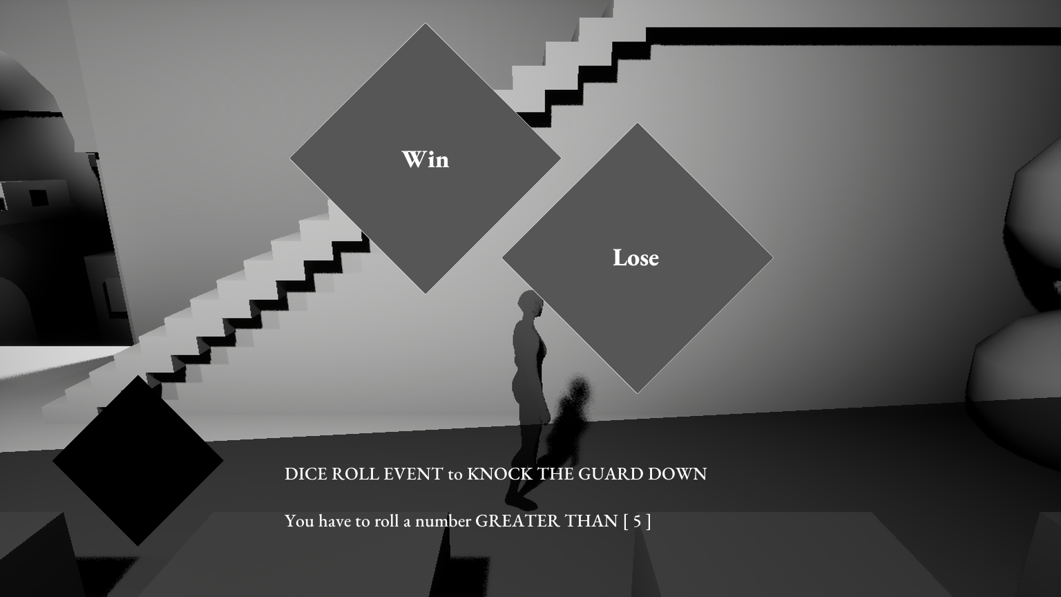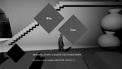 Dice-based Combat: To reflect the protagonist’s misfortune as a banished knight, combat is built around dice rolls. Players have a fixed pool of 10 dice for the entire game and must choose how many to spend to meet encounter requirements. Failure results in a game over, turning dice into a finite resource that reinforces meaningful risk-taking: spend fewer dice for greater danger, or play it safe at the cost of limited resources later.